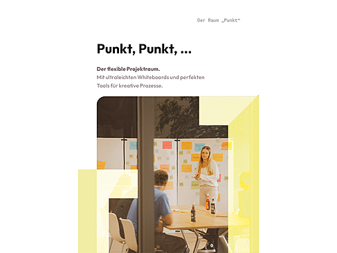Der Raum „Punkt“ ist unser Highlight für agiles Arbeiten – mit mobilen Whiteboards, variabler Möblierung und Zugang zur Lounge für konzentrierte Pausen oder Austausch mit anderen Professionals.
